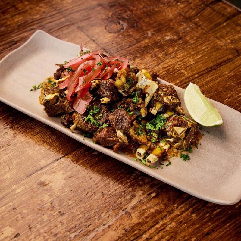 Fried halal goat, citrus sazon, pickled red onion, pepper sauce, and lime.