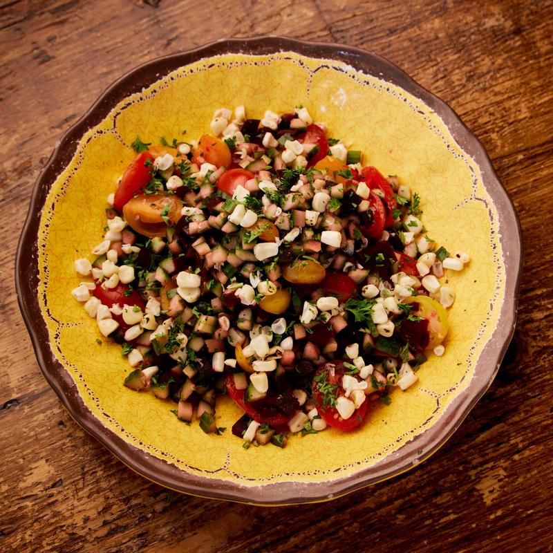Heirloom tomato, beet, charred Brentwood maiz, cucumber avocado mousse, sofrito vinaigrette.